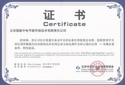 榮獲“中關(guān)村示范區(qū)信用一星級(jí)企業(yè)證書”